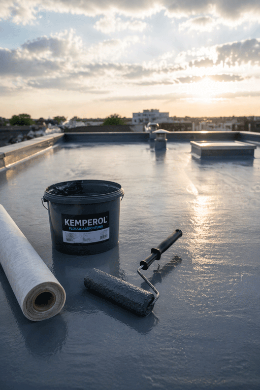 Mit KEMPEROL setzen wir auf eine moderne Flüssigabdichtung, die sich flexibel an unterschiedliche Dachsituationen anpassen lässt.